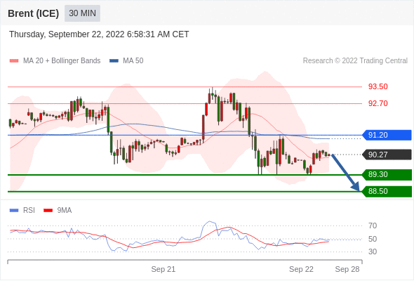 布伦特原油 (ICE)? (X2)? 当日内: 短期关键阻力位在91.20。