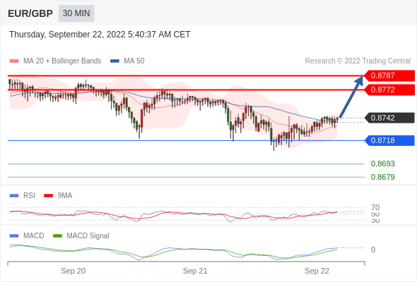 欧元/英镑 当日内: 看涨,当 0.8718 为支撑位。