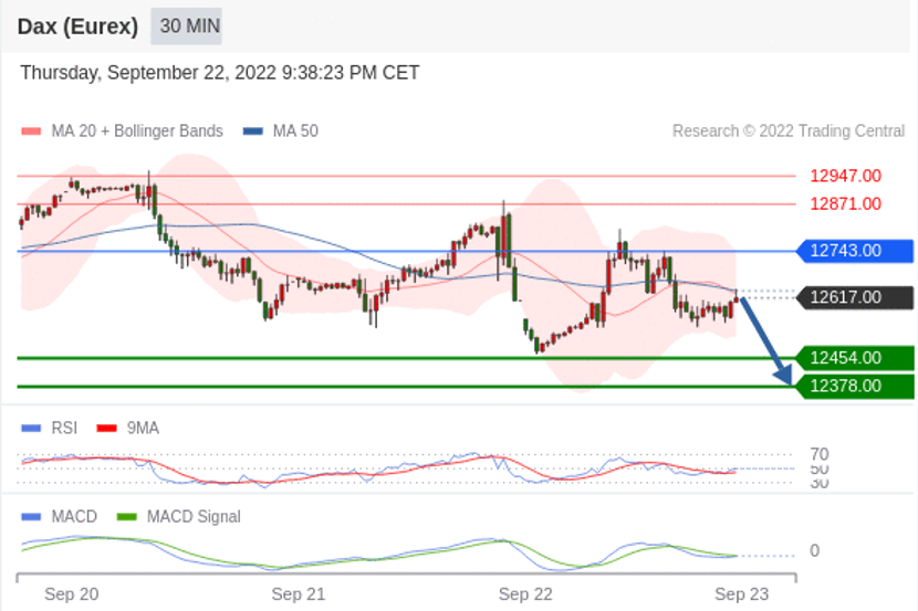 RSI技术指标小于中性区域50。 MACD技术指标呈现看跌状态并 处在其信号线的下方。 此外,价位处在其20个时期及50个时期移动平均线下方 ( 当前是 12629.80 和 12636.72 )。