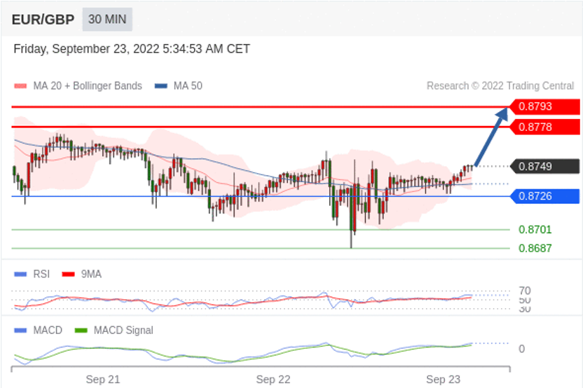 向下跌破 0.8726 ,将带来继续下跌的趋势,目标位为 0.8701 然后为 0.8687 。
