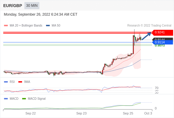 欧元/英镑 当日内: 看涨,当 0.9114 为支撑位。