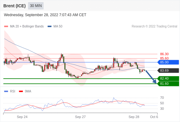 布伦特原油 (ICE)? (Z2)? 当日内: 存在压力。