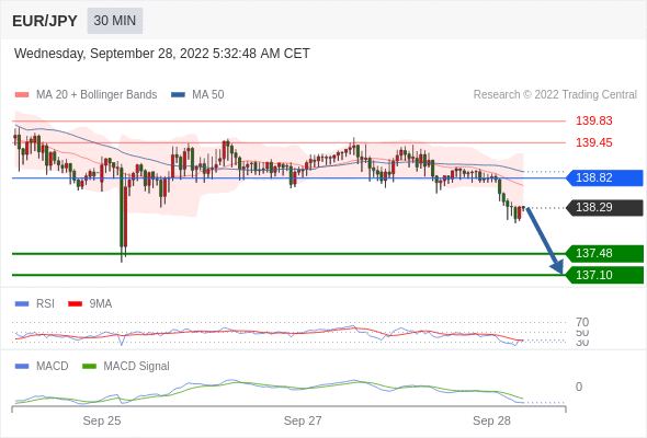 欧元/日元 当日内: 看跌,在 138.82 之下。