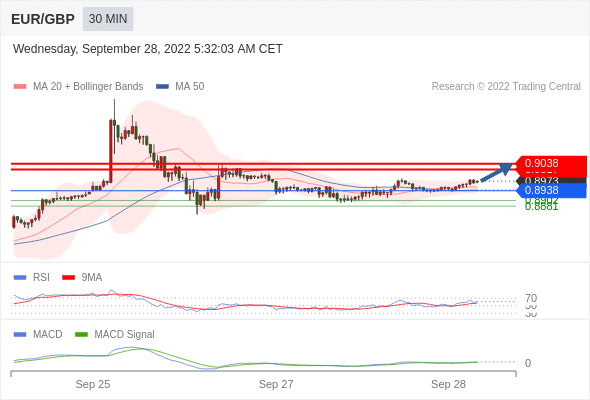 欧元/英镑 当日内: 看涨,当 0.8938 为支撑位。