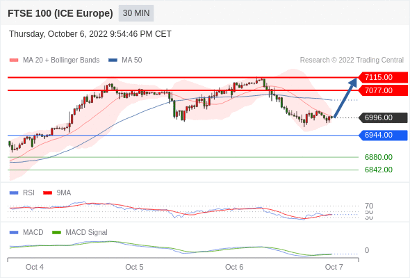 RSI技术指标小于中性区域50。 MACD技术指标呈现看跌状态并 处在其信号线的上方。 此外,价位低于其20个时期及50个时期移动平均线 ( 分别位于 7001.93 和 7048.48 )。