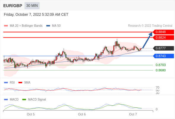 欧元/英镑 当日内: 看涨,当 0.8743 为支撑位,目标定在0.8848。