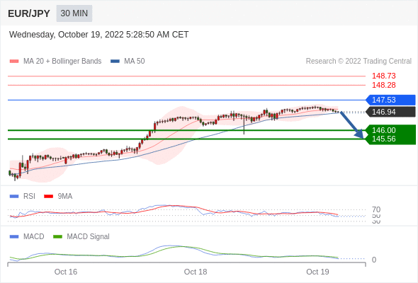 欧元/日元 当日内: 逐渐下跌,当 147.53 阻碍上行,则 145.56 为目标位。