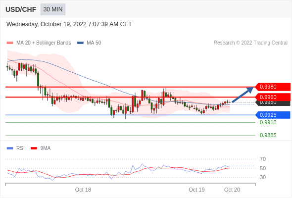 在 0.9925 之上,看涨,目标价位为 0.9960 ,然后为 0.9980 。