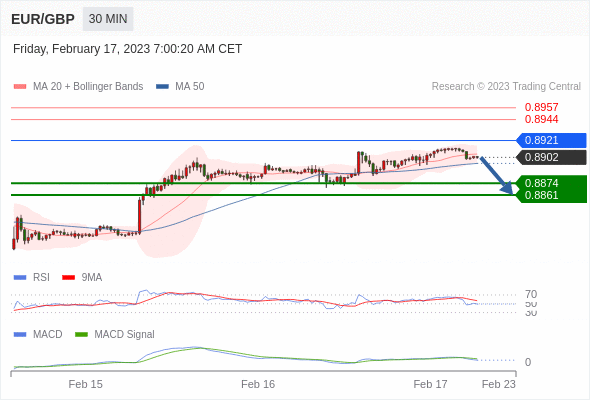 欧元/英镑 当日内: 逐渐下跌,当 0.8921 阻碍上行,则 0.8861 为目标位。