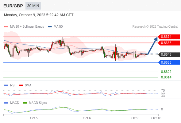 欧元/英镑 当日内: 有上涨的可能,目标价位定在 0.8674 。