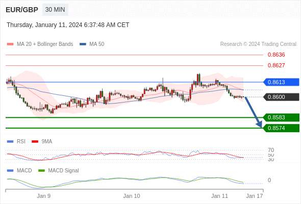 欧元/英镑 当日内: 看跌,在 0.8613 之下。