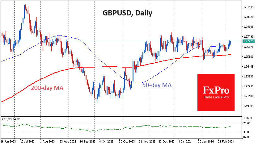 在二月初,美元设法通过一次剧烈的上涨行情巩固了在这条线上方的位置,但这并没有让其进入人们期望的增长区间内。在去年十一月和十二月,下一步举动将是降息这一信号几乎让美元贬值了近 6%。随着对第一次降息的预测从三月推迟到六月,以及今年的降息次数从 6 次减少到 3 次,美元只能够收回其中一半的损失。
