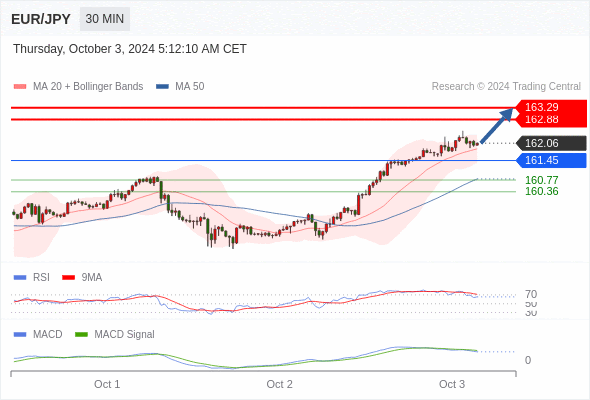 欧元/日元 当日内: 看涨,当 161.45 为支撑位,目标定在163.29。