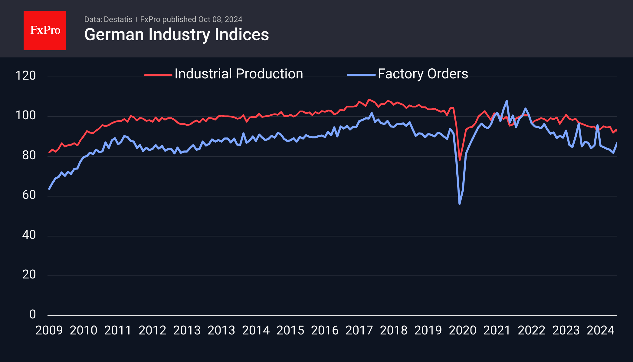 在这两种情况下,优于预期和强于预期的数据并没有改变总体令人担忧的情况。德国工业生产年同比下降2.7%,自2023年2月以来一直处于下降阶段,我们看到在2017年底达到了全球峰值。
