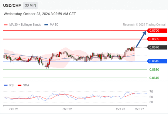 在 0.8645 之上,看涨,目标价位为 0.8685 ,然后为 0.8700 。
