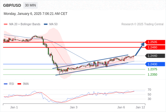 在 1.2400 之上,看涨,目标价位为 1.2480 ,然后为 1.2505 。
