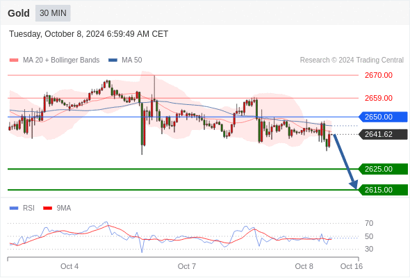 查看交易中心全球研究部门今日的市场观点。从受欢迎的交易产品中探索新的交易方法与机会。 欧元/美元黄金现货英镑/美元欧元/日元欧元/英镑美元/瑞郎德国DAX指数期货(urx)布伦特原油(IC)英国富时100指数期货 黄金现货当日内:存在压力。 转折点: 2650.00 交易策略: 在2650.00之下,看跌,目标价