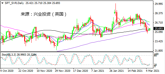 日图短暂下探25下方后回升,随机指标倾向自超卖区域回升。4小时图仍处于下行走势中,但短线有上破MA20阻力进一步反弹的倾向。小时图反复测试25一线后收录曙光初现组合,当前上破整理高点25.45,有望进一步上行。日内建议25.45上方做多,先看26.00.