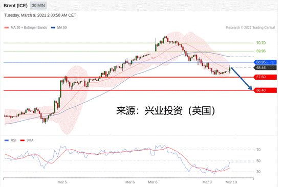 交易策略:在68.95之下,看跌,目标价位为67.60,然后为66.40。