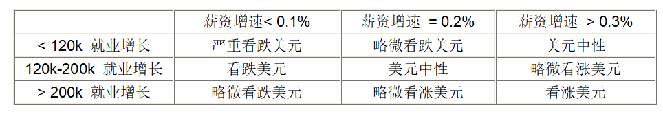 薪资和就业不同表现对应的美元潜在走势如下表: