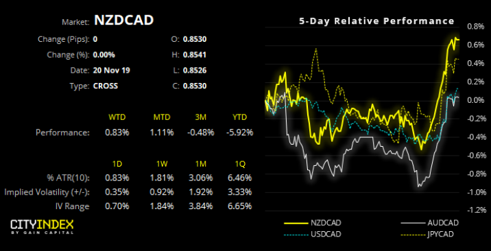 CPI:加拿大央行通胀年率报在1%-3%的目标区间的中轨:标准CPI年率为1.9%、平减均值为2.1%、加权均值为2.2%。但以月率为基础,CPI前四次读数有三次收缩,其中9月读数在-1标准差下的-0.15%。这些月度数字最终将推低移动缓慢的年率数字,所以,如果再现一次负值读数可能提升加拿大央行12月或2月降息的预期。而且,如果油价下跌 <https://www.cityindex.co.uk/market-analysis/markets-not-all-in-on-saudi-aramco-ipo-china-us-trade-deal-strokes-fears/>,可能进一步施压加元,最终推低通胀。