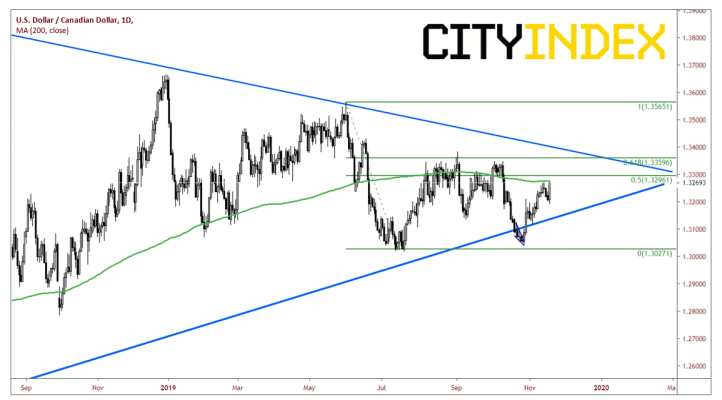 美元/加元今天上涨0.5%,但上方筑有强阻力(当然有阻力,价格正处于三角形的顶端!)。4小时图上,价格上攻10月10日高点到10月29日低点的78.6%回档位1.3280。其上还有以前低点形式构成的水平阻力位1.3290,而一根上涨趋势线就在1.3300下方。请注意价格的高点上抬以及RSI的高点下降。今天价格站上前高点,比其高出1.5点子。价格形成了3个上抬的高点而RSI出现3个下降的高点,这是市场发出的强警告,即价格可能反转。另外,200天均线落在1.3275。