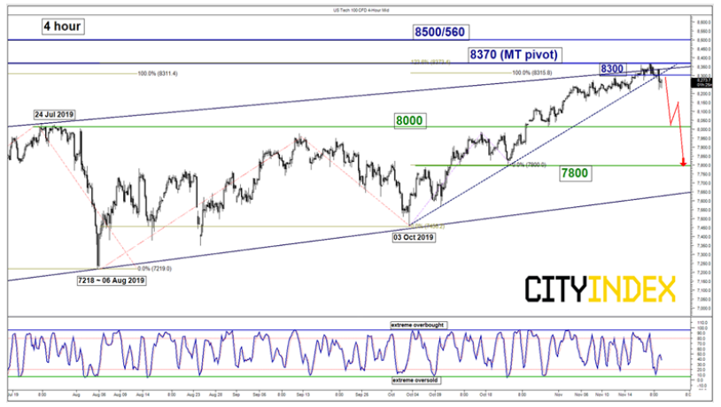 §从较短期来看(4小时图),纳斯达克100指数已经自10月3日低点以来的小级别上升支撑位向下突破,使得该支撑现转化为回档阻力位,并且落在8300。这暗示,小级别上涨趋势已经遭到破坏。