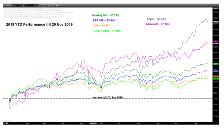 §2019年年初到2019年11月20日,纳斯达克100指数就是表现最好的美国主要股指(剔除分红上涨30.23%)。苹果(Apple)与微软(Microsoft)分别以66.66%和47.96%的涨幅对纳斯达克100指数的总回报率做出了最重要的贡献。