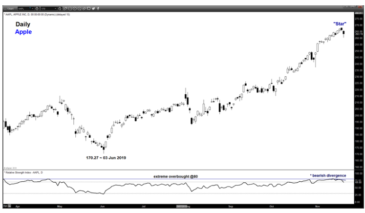 §继11月19日形成“流星”K线并伴随着日图RSI在严重超买位形成看跌背离信号后,苹果在昨天(11月20日)美国时段收盘时于日图上形成看跌K线。