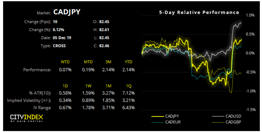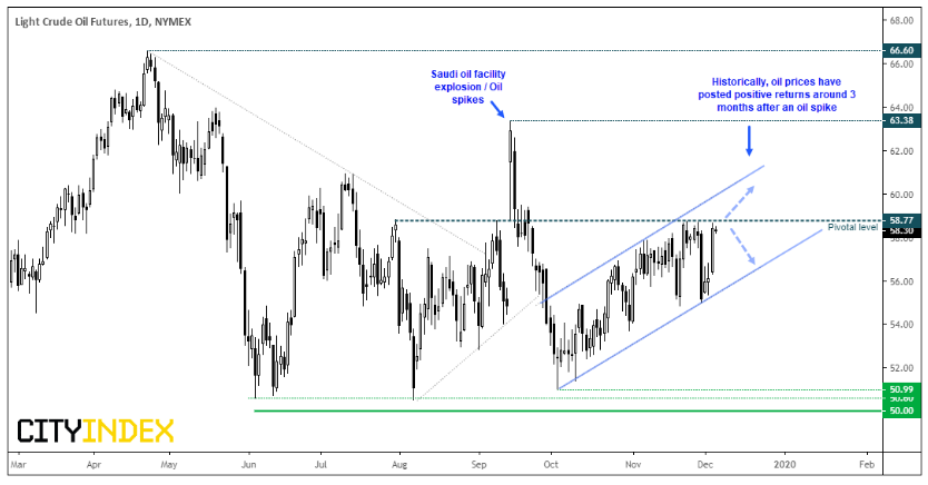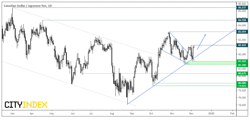 加元走强的一个明显的主要因素是上述积极的展望,但油价的上涨也发挥了作用。数据显示,原油库存意外减少 <https://www.cityindex.com.sg/market-analysis/market-brief-oil-catches-fire-after-surprise-inventory-drawdown/>。西得州原油实现9月冲高以来涨幅最大的一个时段。如果远期回报可信,那么油价可望在12月中旬反弹。从历史看,在冲高后油价通常反弹3个月时间 <https://www.cityindex.com.sg/market-analysis/how-wti-has-traded-following-bullish-spikes-of-the-past/>。