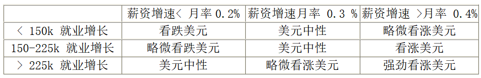 薪资和就业不同表现对应的美元潜在走势如下表: