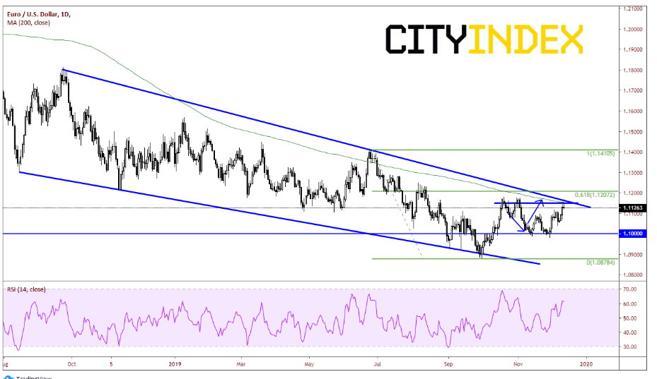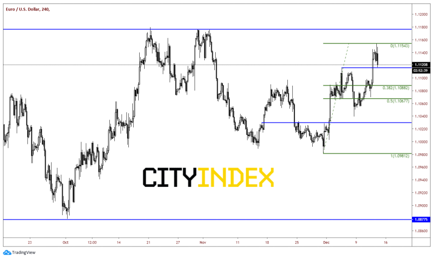水平支撑位在1.1107,然后是11月29日低点到今天高点的38.2%和50%回档位,该回档位之下是水平支撑位1.1030。