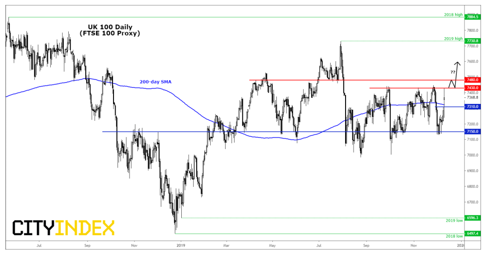 鉴于中国市场之于全球经济的重要性, 最新的贸易进展对市场而言无疑是件大事。对中国这个全球第二大经济体的出口最近遭遇重创的欧元区来说,尤其重要。所以,阶段性的贸易协议应可缓解部分成长关切。但要注意,市场计入这样的结果到现在已经有段时间。所以,可能已经体现于市场走势中。美国市场本周还可以反弹多高值得关注,我个人认为空间不会太大。但欧洲市场可以补涨,而随着脱欧不确定性有所减弱,FTSE的补涨效果可能尤其明显(请看下图)。焦点现在将转向阶段2贸易协议:根据美国总统的说法,将马上启动。中国表示,阶段2协议的谈判将取决于阶段1协议的执行情况。这可能又是一场漫长、令投资者坐卧不安的拉锯。