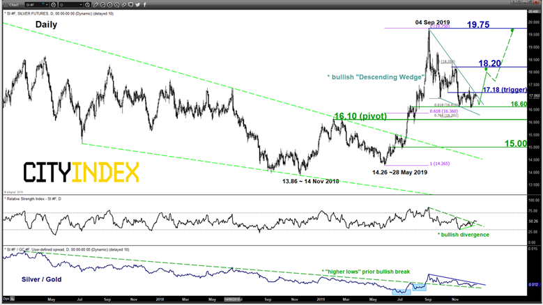 “下降楔形”当前的波段低点16.60紧挨着一个斐波纳契回档/扩展群,暗示那是一个潜在看涨转折点。