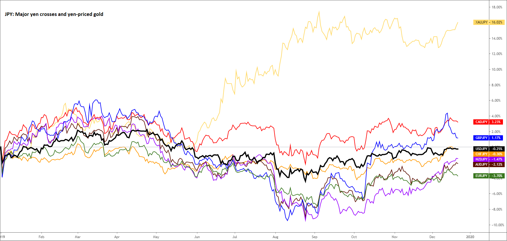 英镑交叉盘:英镑/日元独占鳌头,但英镑/加元仍是主要英镑交叉盘中唯一下跌的一个。受绵延数年的脱欧相关不确定性的拖累,英镑今年低开。后来投资者逐渐认识到大选可能终结僵局,英镑迅速反弹。大选前投资者开始计入保守党取得多数席位的前景,而保守党以绝对优势胜出更是证明了其看法。英国大选的结果意味着脱欧方案终将得到保守党主导的议会的批准,为1月31日的正式退出与11个月过渡期的开启铺路。但英镑的“好日子”转瞬即逝,因为在首相拒绝将脱欧延期到2020年结束之后,无协议脱欧的前景卷土重来并成为核心关切。英镑兑美元在大选后回吐逾500点子,跌落领涨榜。在进入新年之际,脱欧相关不确定性仍将是英国投资者的主要关切 – 但至少出现了曙光,即使在数英里之外的隧道尽头。