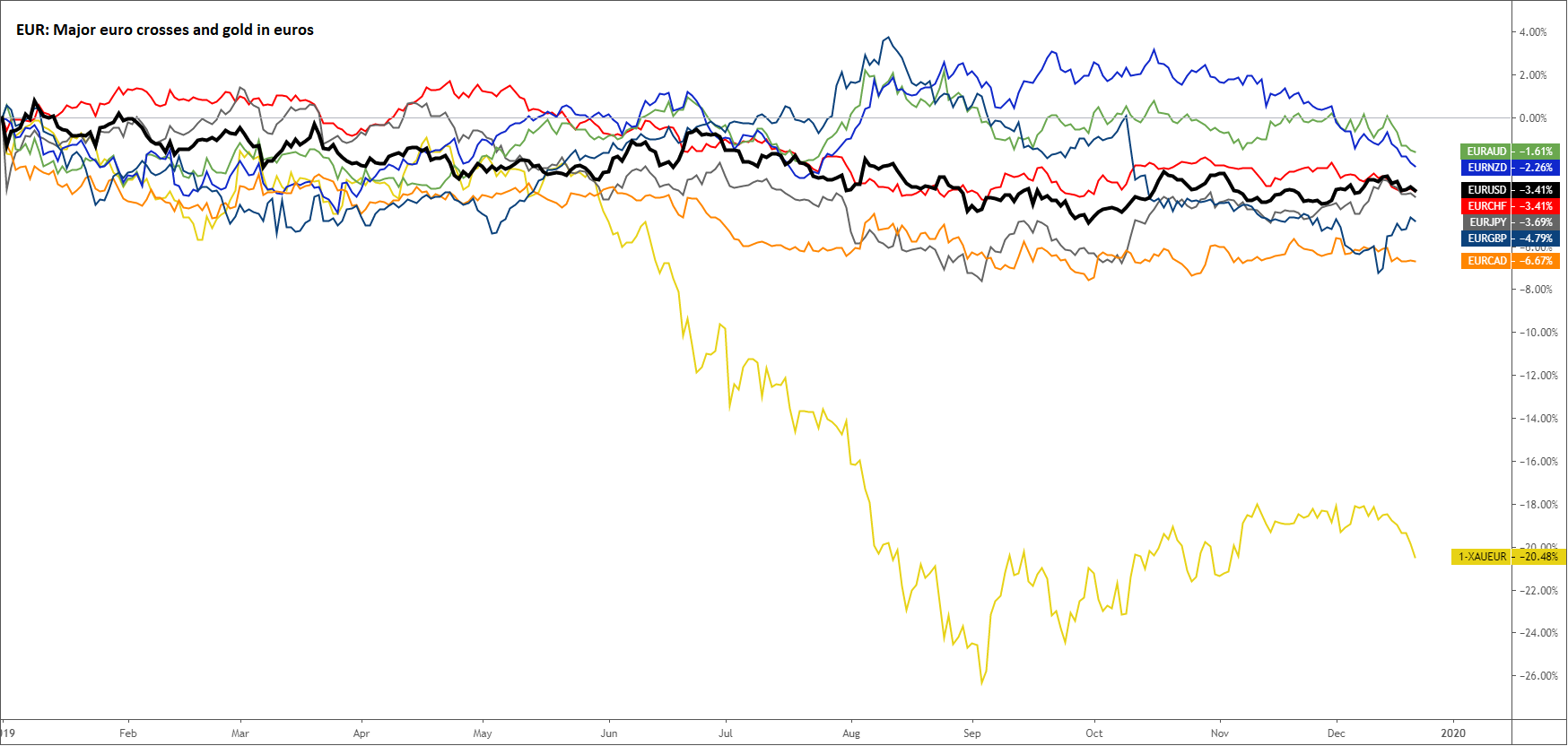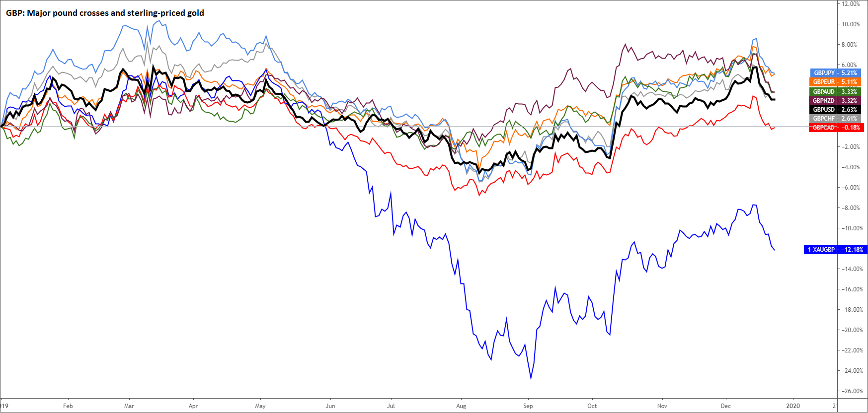 欧元交叉盘:欧元兑所有主要对手在2019年悉数下跌。欧元/澳元的表现可能最好,但今年迄今(圣诞节的一天)仍然下跌。澳元相对其它主要商品货币承压,原因是澳洲联储降息以及对疲弱经济增长伤害大宗商品买需的关切。而欧元/加元因为加元大放异彩(请看上文)而垫底。
