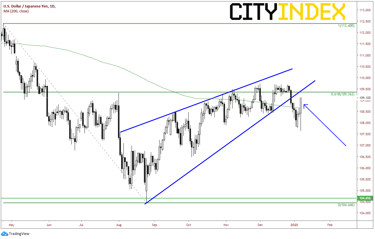 过去几个月,我们从各个技术面角度审视美元/日元。首先,我们认为那是一个失败头肩底形态,原因在于短暂上穿109.50颈线后未能守于其上。其次,我们发现攻克109.36附近,即4月3日高点到8月26日低点的61.8%回档位以失败告终。最后(目前可能依然成立),我们认为低点以来构成上升楔形形态,价格于12月30日向下破楔形。上升楔形的100%回档位可能指向104.50附近。