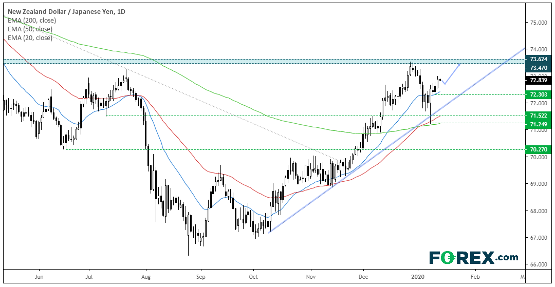 纽元/日元:日图趋势结构整体上坚定看涨。一根长看涨锤子K线的低点止步于50和200天指数移动均线,并且50天均线早已上穿200天均线且双双上翘。从更近的时间看,价格守住20天指数移动均线,而且昨天收于7天高点。