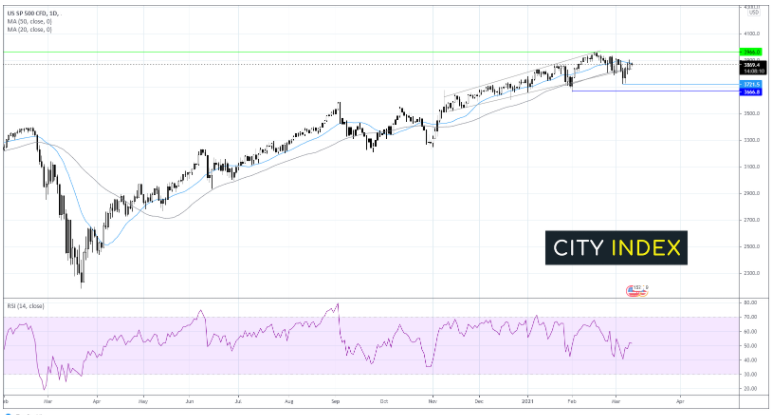 11月初以来标普500指数一直交投于上升通道内。在2月中旬创下历史新高3966后,股指回落。
