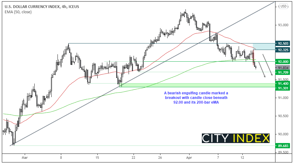 美元指数终于突破区间并坚定地收在92.00支撑位下方,完好地维持了对其上涨趋势线的突破。美元指数下个关键支撑位在91.30/40附近。目前50天指数移动均线构成支撑位而20天均线构成阻力位,但受制于93.33的话当前动能支持价格延续下跌。
