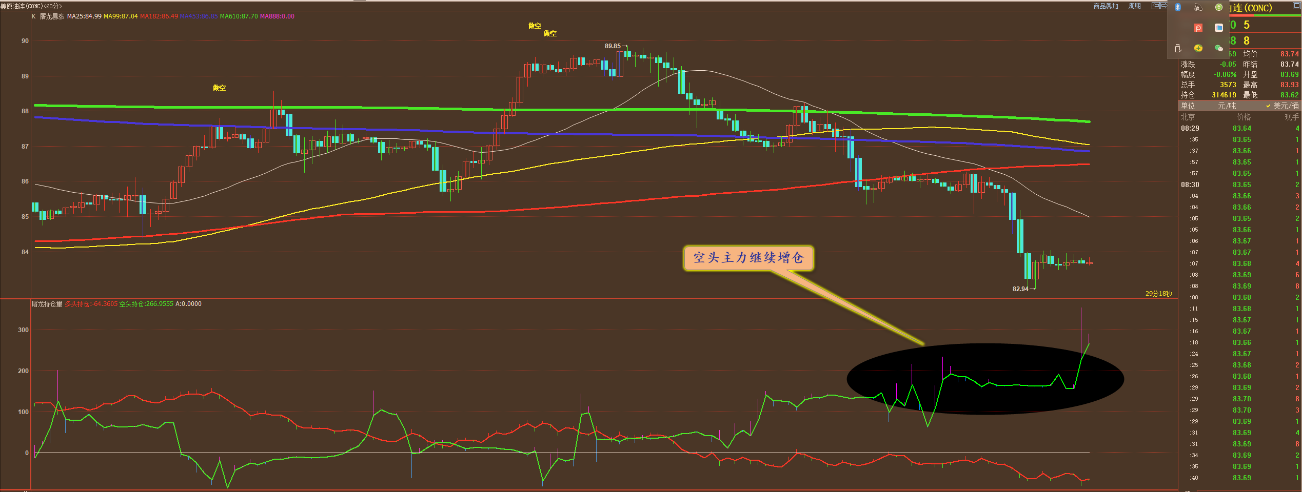 通过对原油小时图解析得知,昨日行情如期继续下跌,在盘中反弹无力一度放量跌破前期的低点位置支撑,目前反过来已经成为压力,我们从下方的幅图可以清楚地看到空头主力继续增仓介入从而导致行情进一步的回落调整,短期进一步回落的可能性比较大一点,短期上方我们重点关注84.90一线的压制,下方重点关注80.80一线的支撑,短期在操作上我们继续高空低多思路,重点逢高做空,具体建议如下: