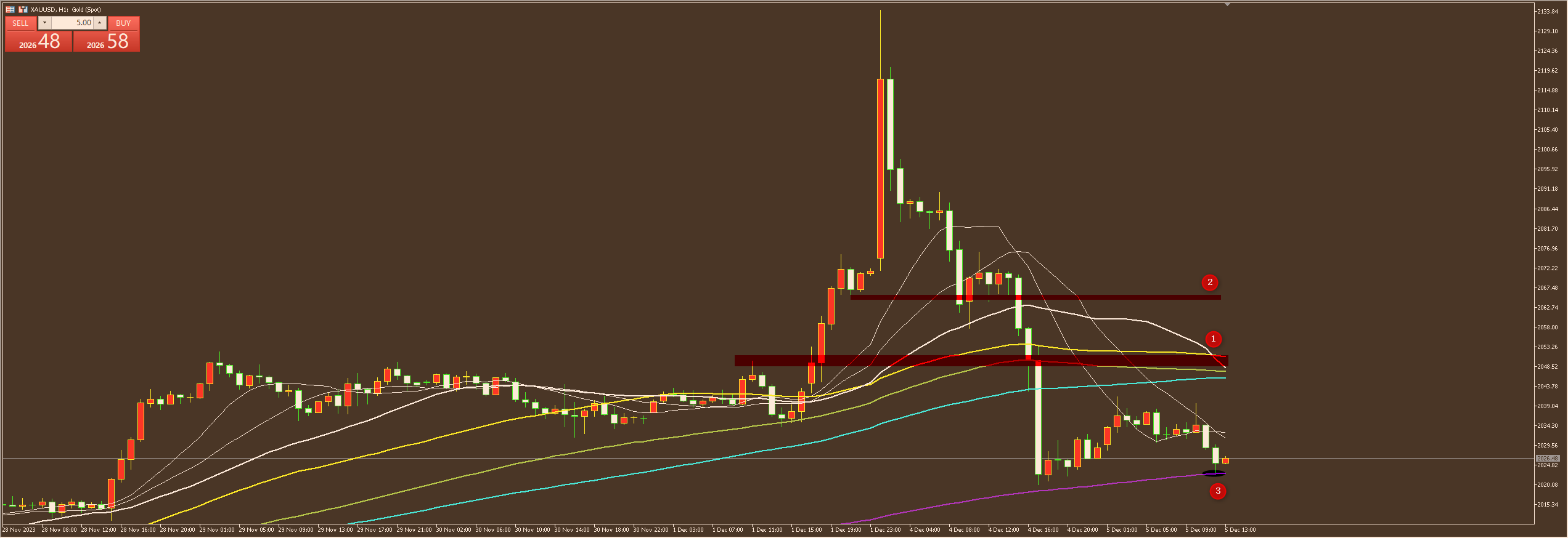 通过对黄金小时图解析得知,黄金从早盘继续冲高回落在上方2041附近受阻回落正如小妹中午所说行情目前不具备反转短期应该是还要震荡调整的,刚才在下方3号均线支撑位有所反弹,短期相对而言将会继续震荡调整运行,不排除继续向上反弹短期我们上方重点关注12号压力位,短期在操作上我们继续高空低多思路,具体建议参考早盘策略