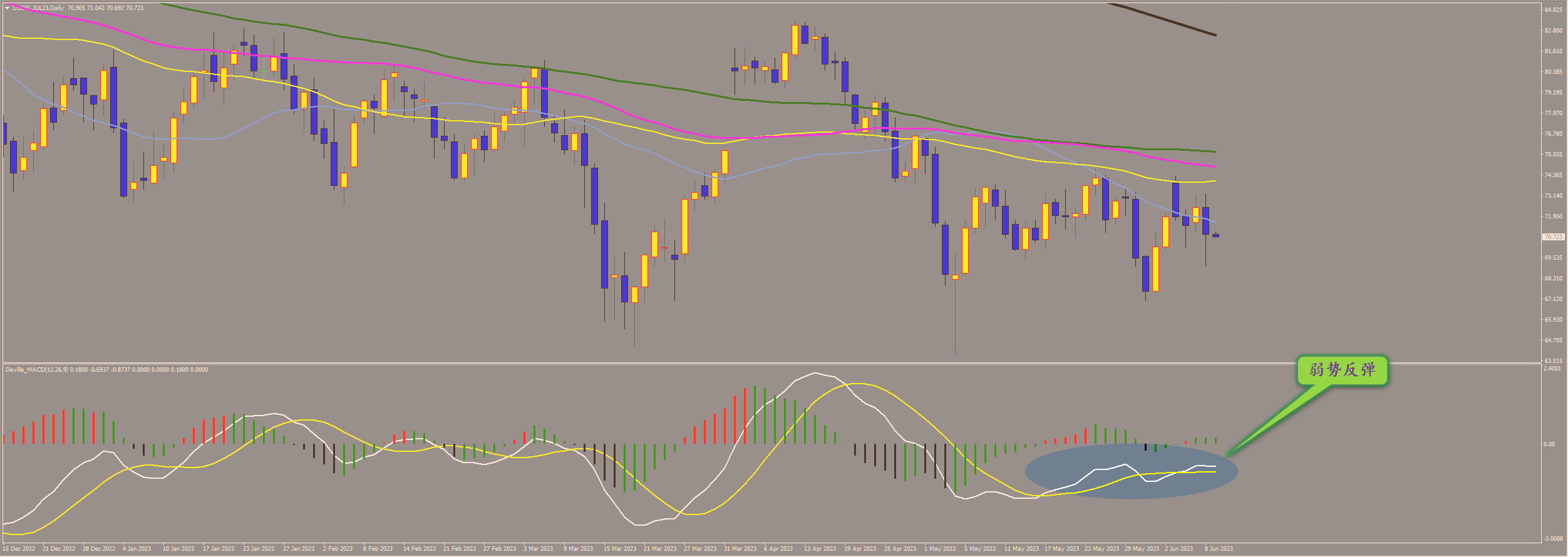 通过对原油日线图解析得知,上一个交易日如期反弹到上方1号均线压力位受阻回落目前依然回落调整中,上周小妹就已经说过我们从下方的ACD也可以清楚地看到目前整体一直都是在零轴下方运行近期2个月都是属于弱势盘整动作上方一直受制于均线的压制,非常有可能进一步回落到下方2号均线支撑位(67.10附近)短期在操作上我们继