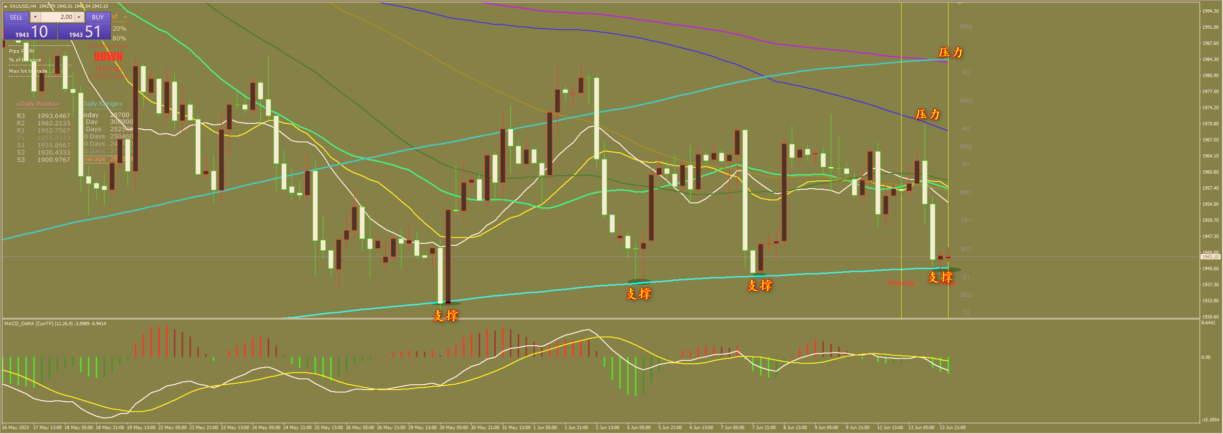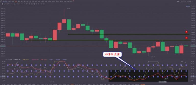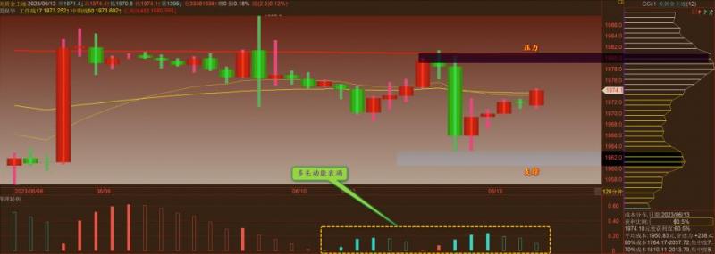 通过对黄金小时图解析得知,昨日行情如期在上方的阻力位冲高回落到达下方支撑位止跌反弹,目前依然是处于反弹过程中,我们从下方的幅图也可以清楚地看到在昨日反弹的过程中多头动能明显表现不足,整体依然是在做窄幅震荡动作,短期上方1967一线依然是短期主力下方1948附近依然是支撑,短期在操作上我们继续高空低多思路