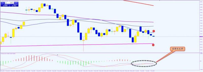 通过对黄金4小时图解析得知,黄金从昨天晚上到目前为止一直是处于反弹过程中,目前相对而言反弹力度有限,我们从下方的ACD也可以清楚的看到目前已经再次回到零轴下方运行有进一步下探迹象,短期下方我们重点关注3号均线的支撑即可,近期的底部处于逐步抬高的状态,综合判断短期将会继续窄幅震荡调整,在操作上我们继续高