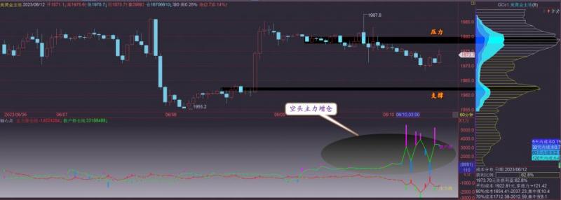 通过对黄金小时图解析得知,黄金从早盘到目前为止意思处于弱势盘整状态,刚才有所反弹但是依然是在1965的压力位下方运行,行情之所以星期五会出现冲高回落,我们从下方的附图可以清楚的看到星期五在高位横盘调整的过程中空头主力不断地增仓介入从导致行情的回落,短期下方我们重点关注下方的支撑1947一线即可,在操作上