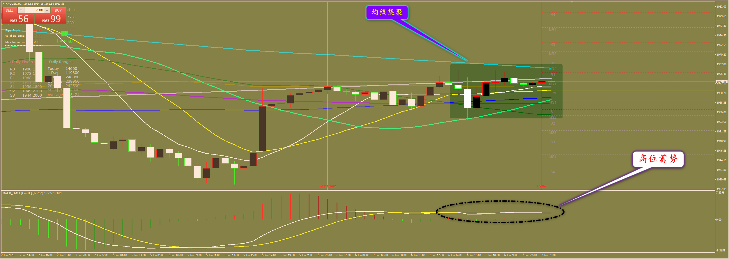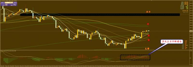 通过对黄金小时图解析得知,昨日行情如期在高位横盘震荡调整,晚间受数据影响冲高回落到达下方均线支撑位止跌反弹继续回归1964一线上周就已经说过短期多头主力要以时间换空间的手法蓄势上涨,我们从下方的ACD也是可以清楚地看到在下方集聚了大量的多头主力,虽然在高位有部分资金出逃但是依然保持强势,从主图的均线系统