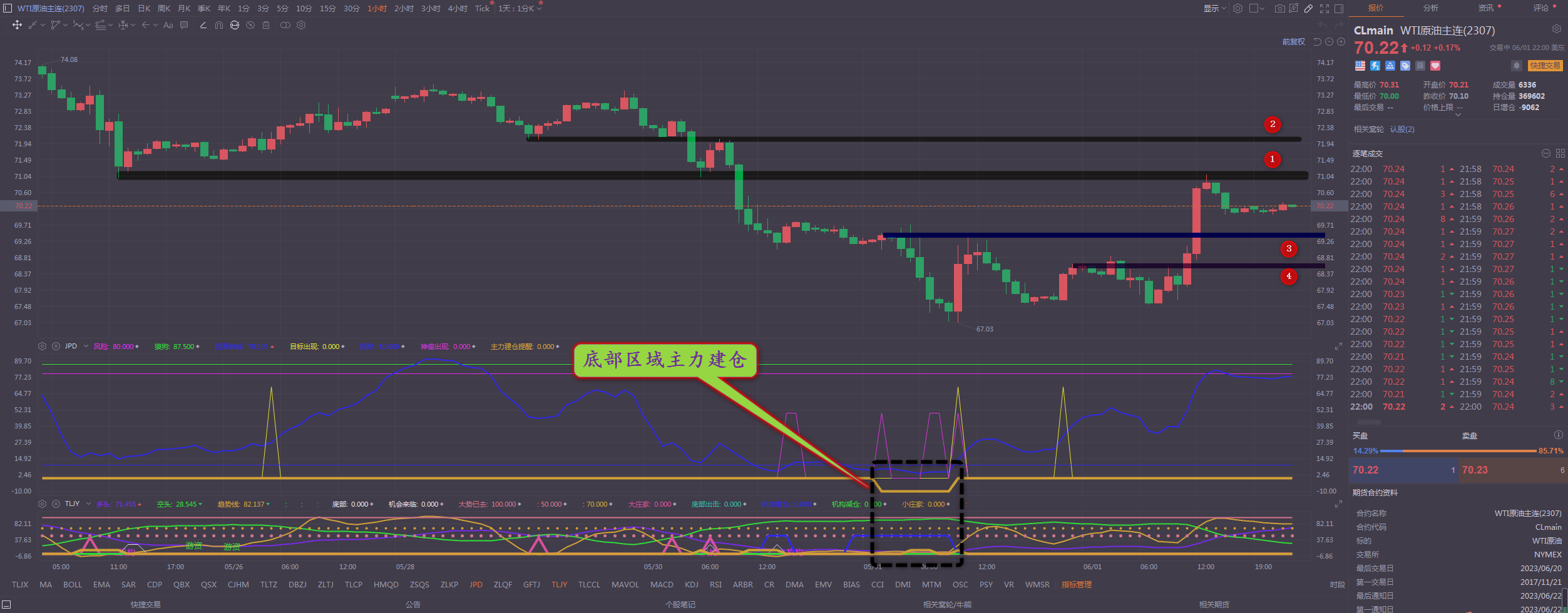 通过对黄金4小时图解析得知,昨日行情延续下跌走势到达下方1974一线止跌反弹动作,之所以会出现止跌反弹动作我们从下方的2个幅图可以清楚地看到大小机构抄底介入并且出现了增仓动作,以及底部区域的绝地反击信号,到目前为止还没有出现大幅拉升,我们继续回归到1970-1980这个区间做多即可,短期上方我们重点关注下降趋势