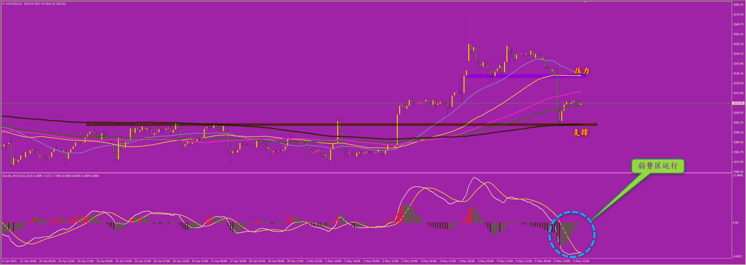 通过对黄金小时图解析得知,上一个交易日黄金如期先跌后涨在下方2000一线止跌反弹目前依然维持在2016一线震荡徘徊之所以会出现止跌反弹动作第一已经到达前期的顶部位置的支撑,第二已经到达下方年线的支撑位,虽然短期得到支撑但是还没有反转不需要站上上方的均线压力位才可以(2035一线),从下方的acd也可以清楚的看到