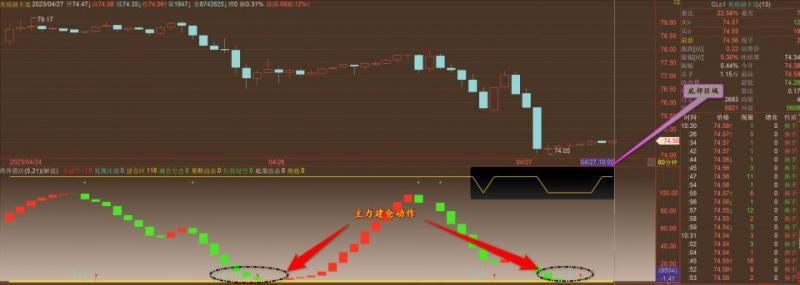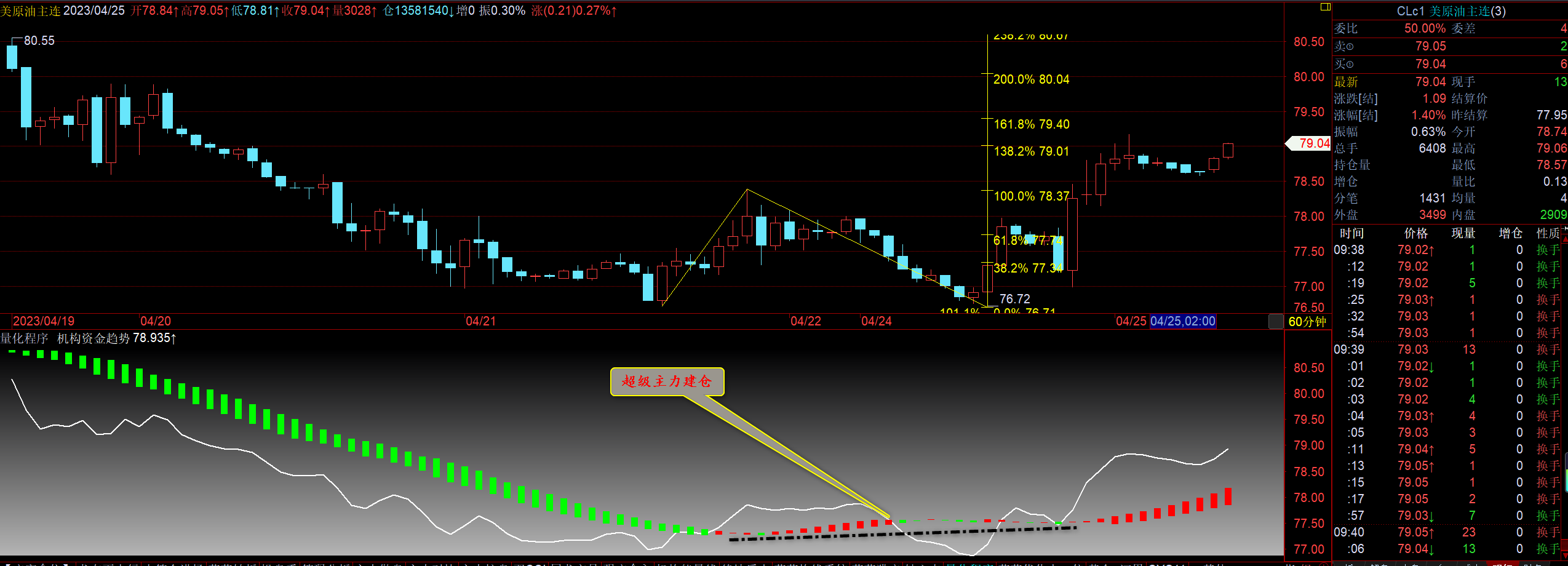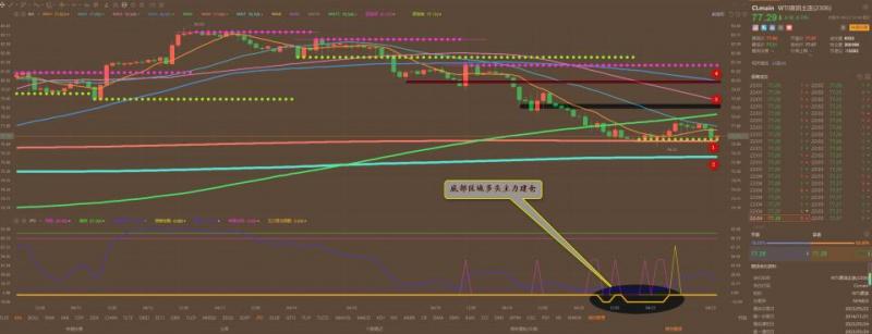 通过对原油小时图解析得知,昨日行情先跌后涨完美形成诱空动作下午开始拉升晚间一度到达79.20一线,目前继续向上运行有进一步突破的可能性,之所以会出现行情的见底反弹上涨我们从下方的附图可以清楚的看到行情到达底部区域超级主力资金大量建仓动作并且形成顶背离动作目前多头主力的势头还没有缩减迹象,通过波浪尺我们